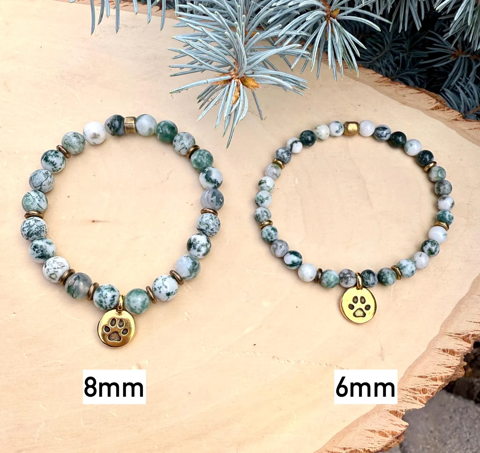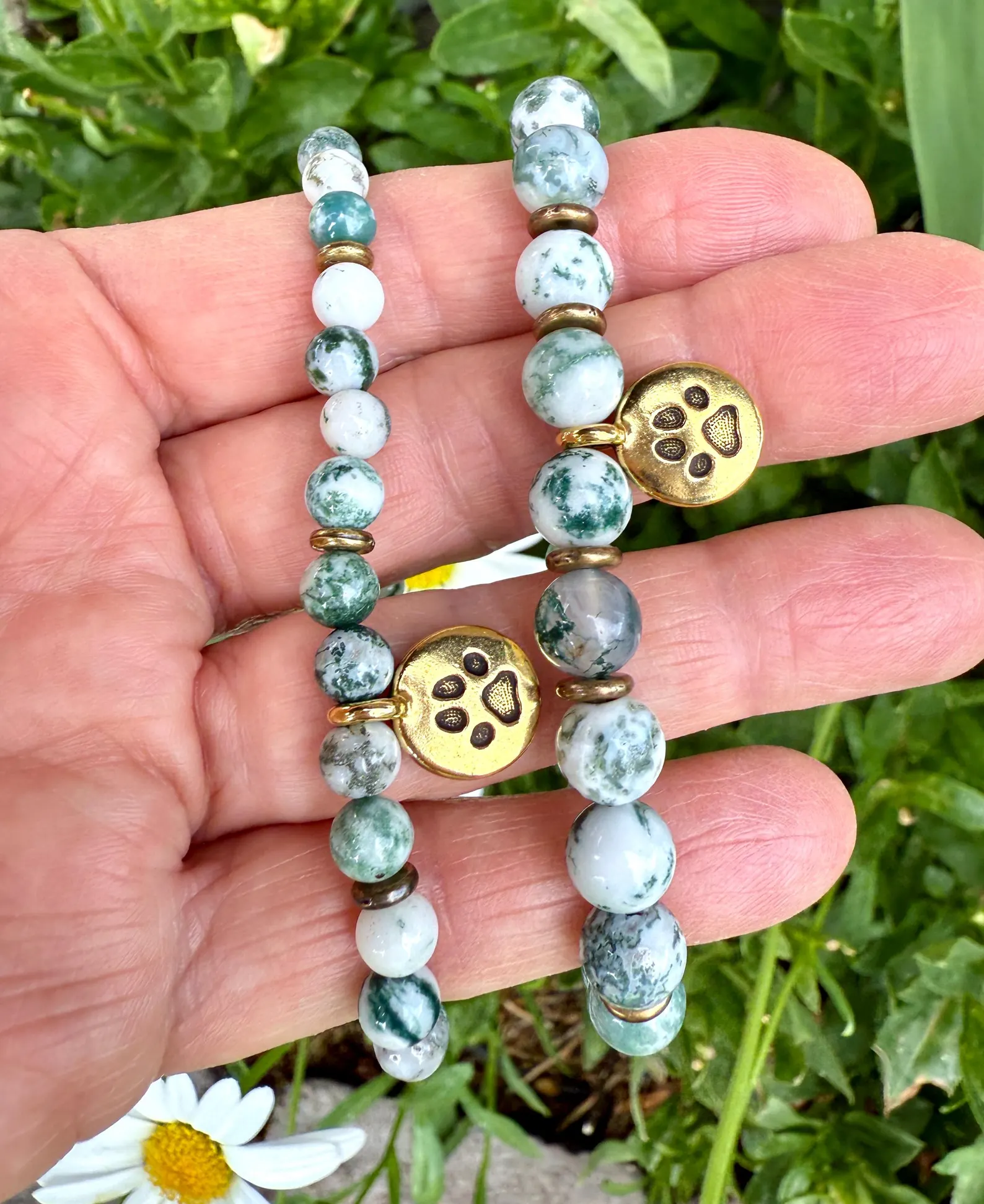 GREEN TREE AGATE Bracelet with Dog Paw Charm, Gold, Stretch, Gemstone Crystal Stone, Dog Lovers Gift