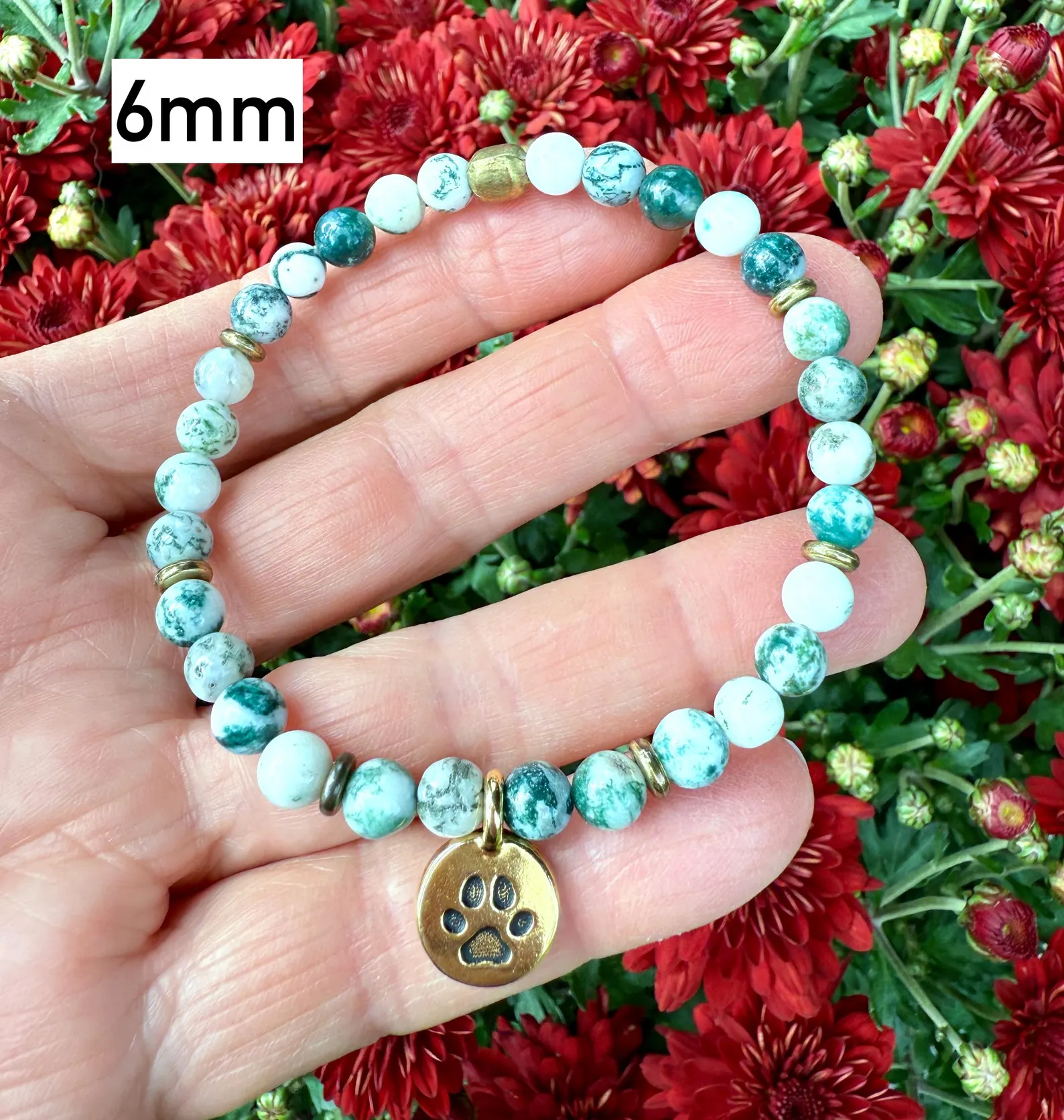 This stretch style features genuine Green Tree Agate stone beads in sizes 6mm or 8mm with brass accents beads and a 12mm gold plated cast pewter dog paw charm. These look great worn separately or stacked with your other favorite bracelets.