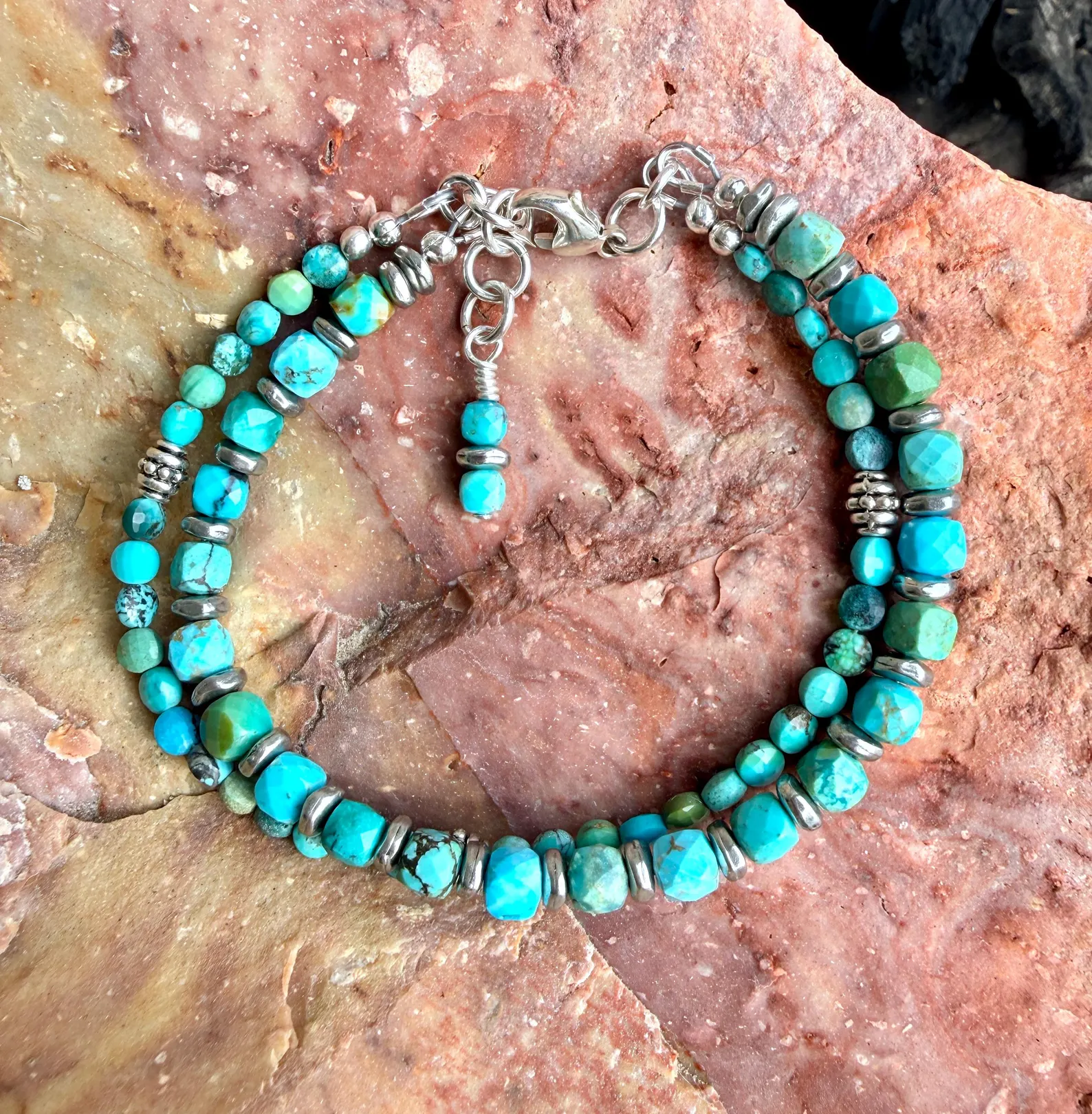 For all genuine turquoise lovers - this unique duo bracelet stack is designed by using 5mm cube and 4mm coin turquoise beads. It's completed with various lead-free pewter beads and sterling silver clasp and wire. Wire-wrapped beads dangle from the clasp wire helping you to attach the clasp more easily. The turquoise stone beads are a mix of blues and greens with some veining.