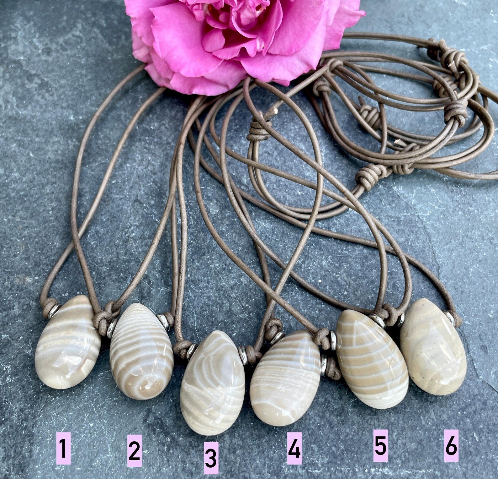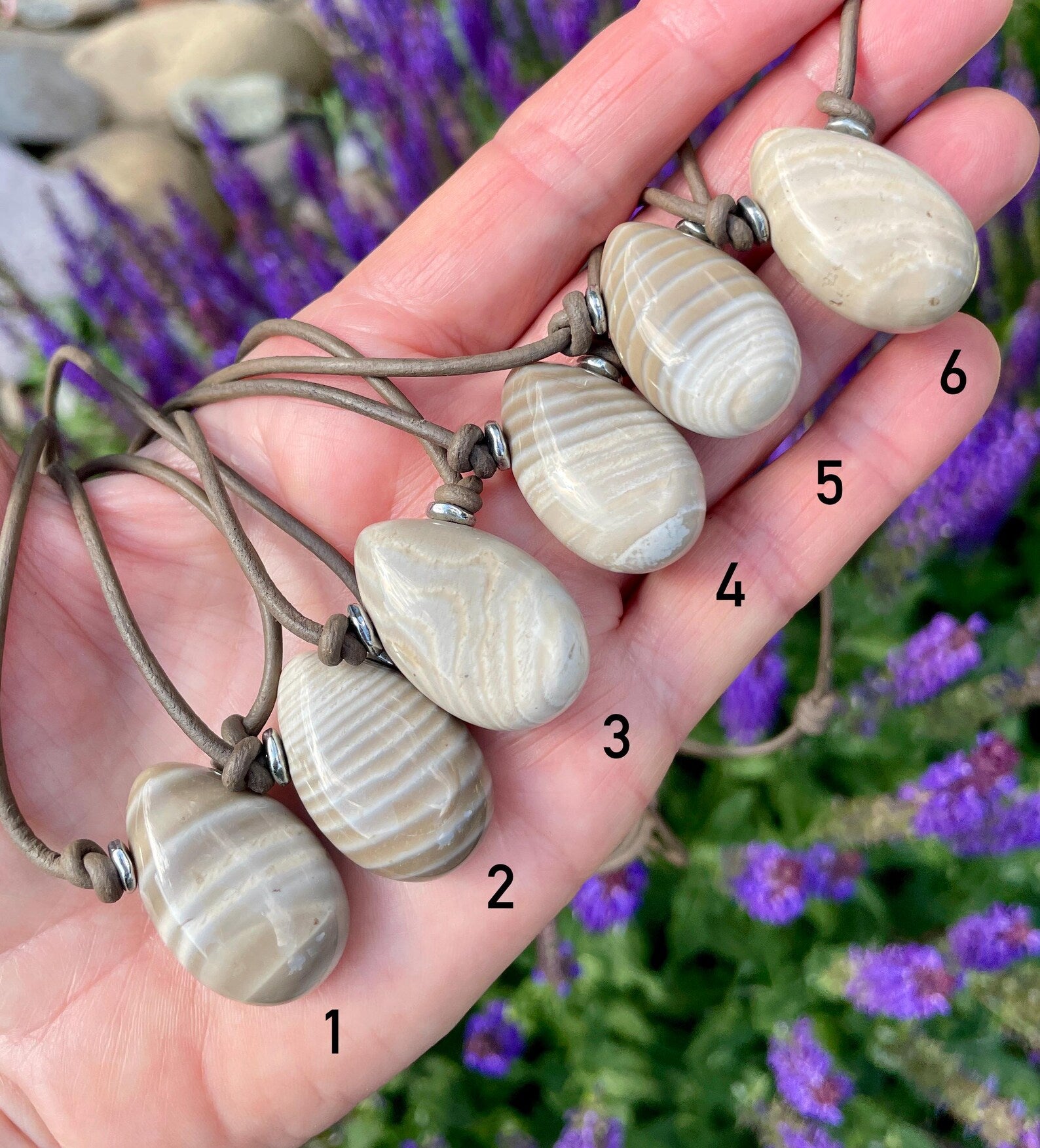 So happy to have found some beautiful banded POLISH FLINT PENDANTS that we made into adjustable necklaces! We added two silver heishi nugget beads and brown leather cord that's adjustable from 14" up to 22". The flint pendants measure 1.2" x 7." x .5" and each display different banded patterns.