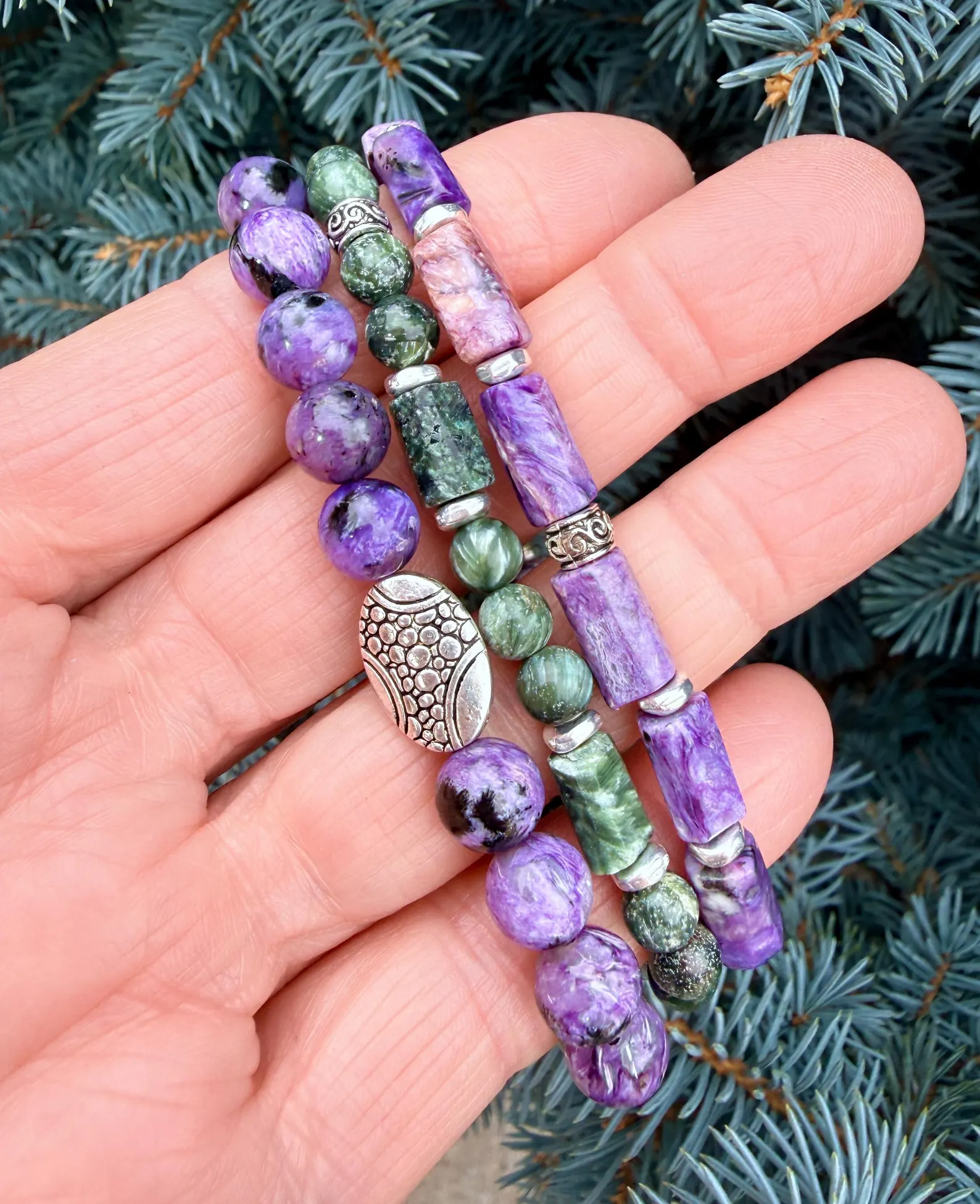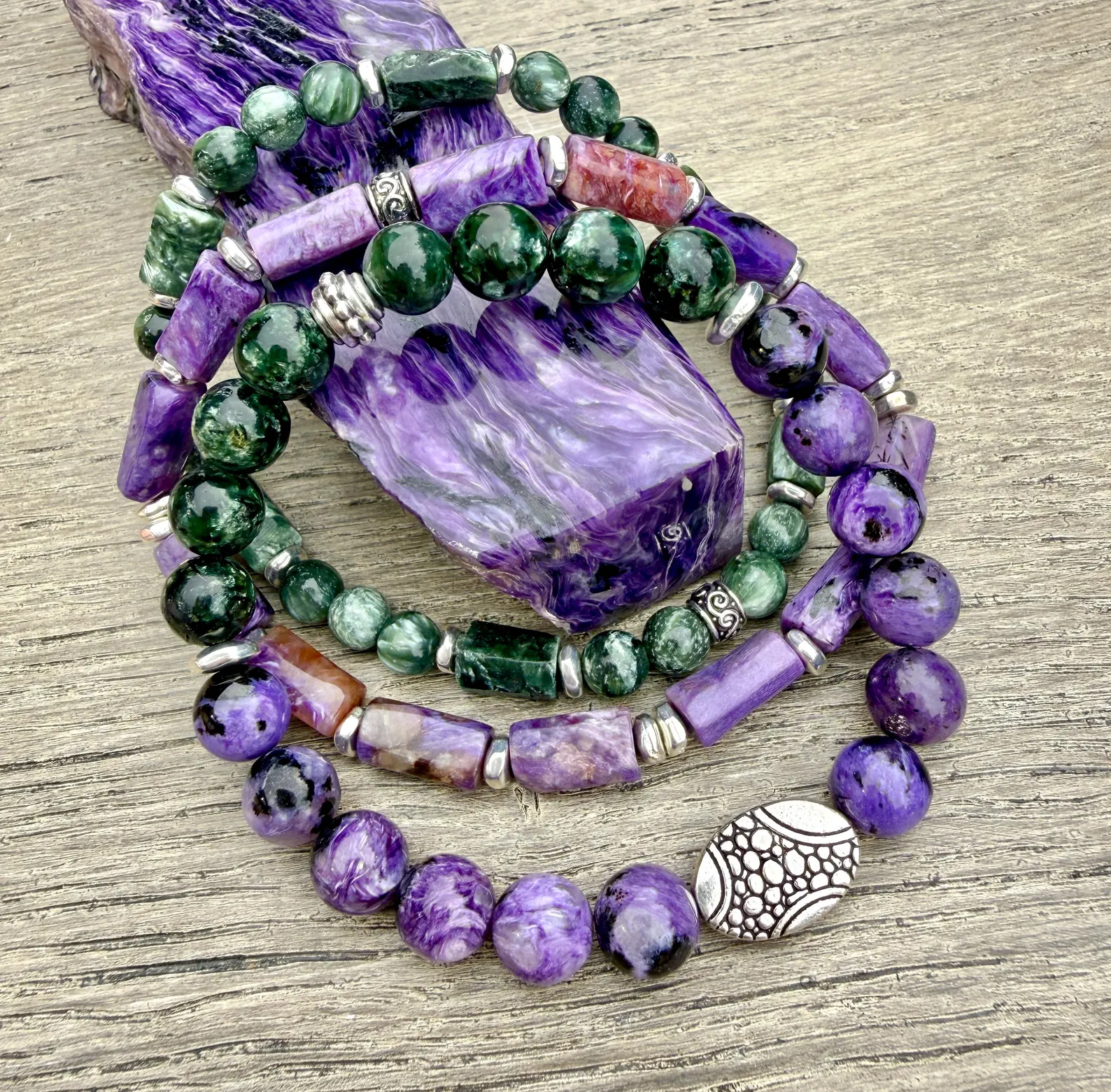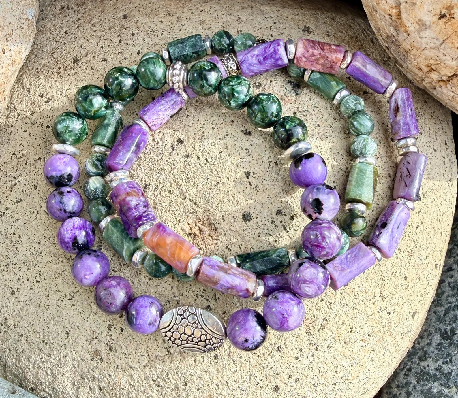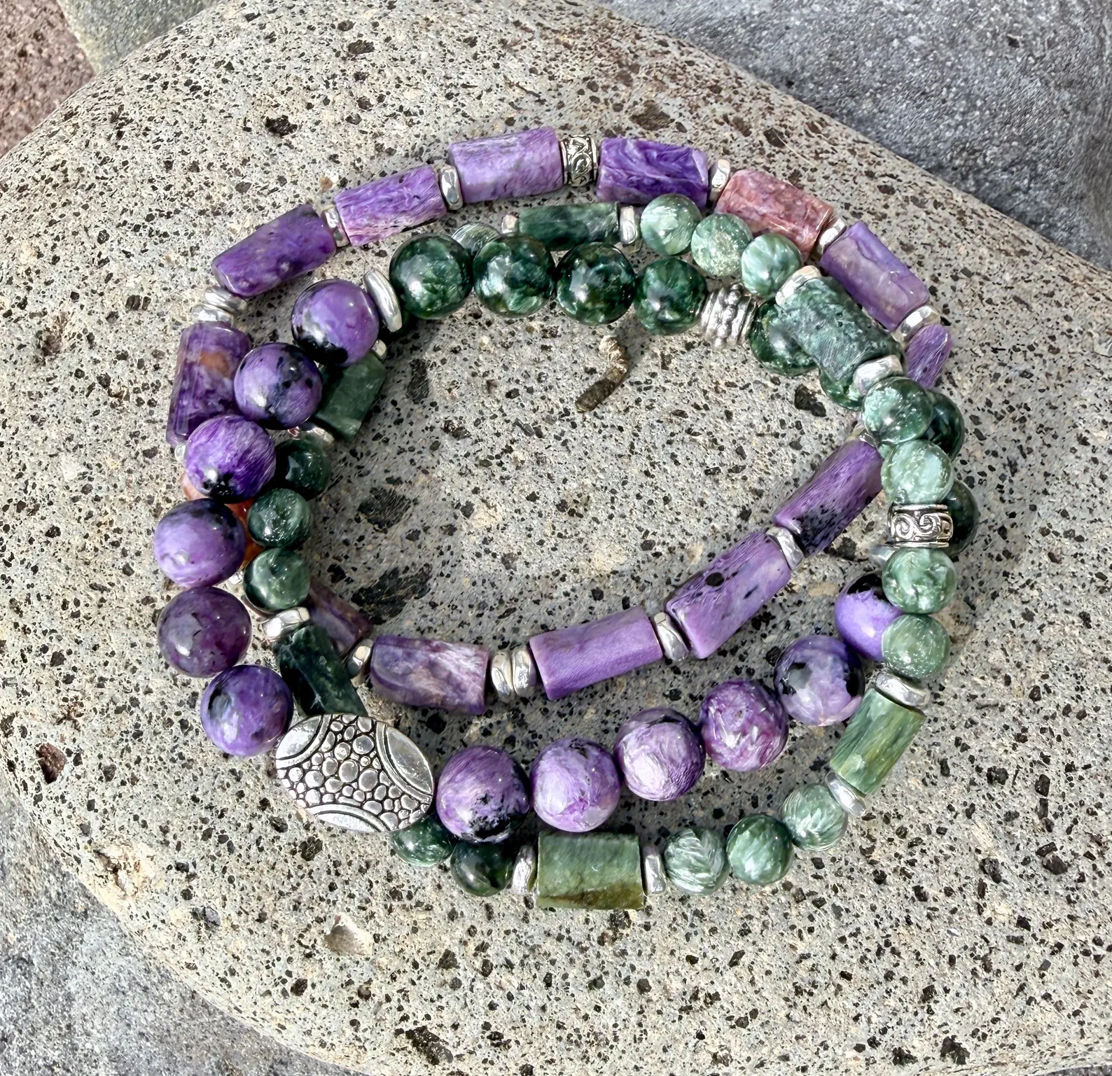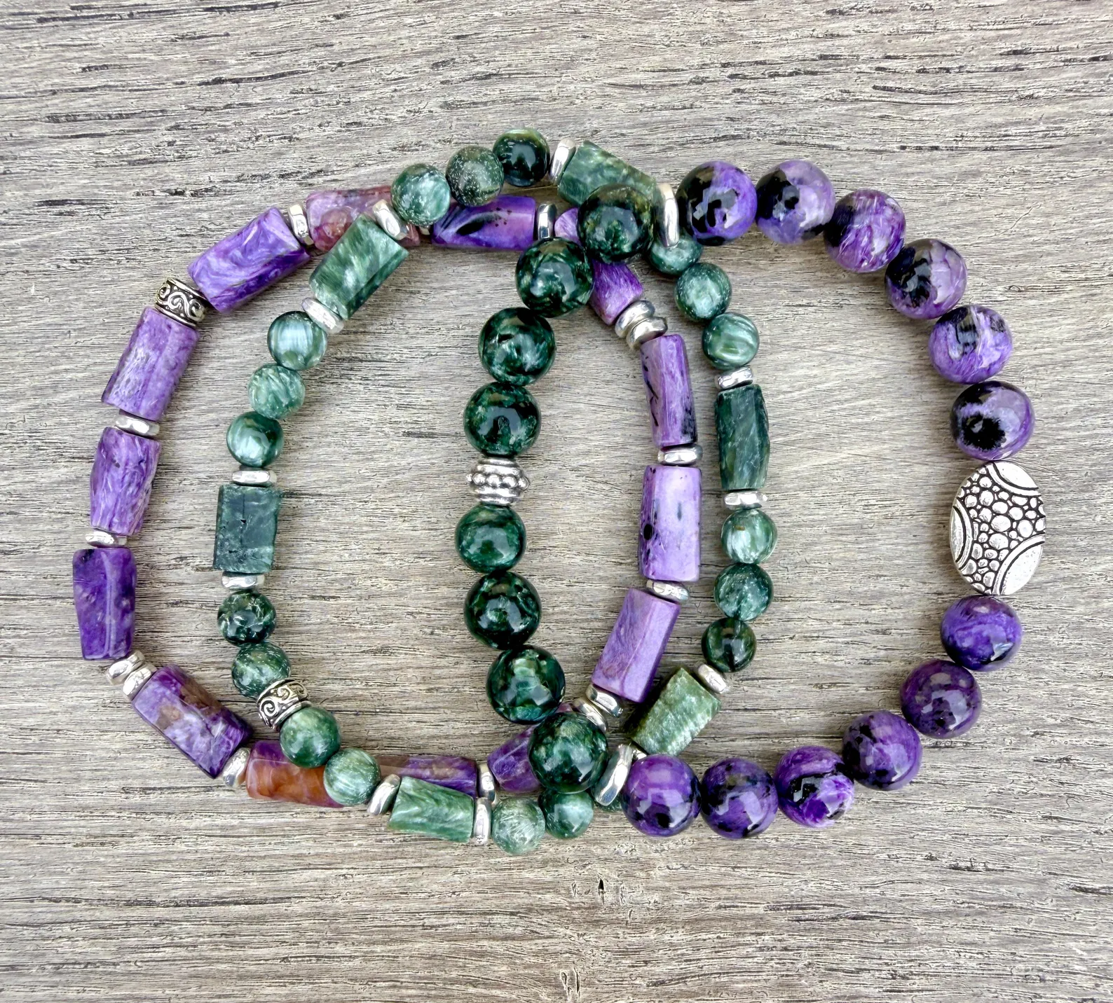 #1 CHAROITE & SERAPHINITE: Includes 8mm round beads, accented with a pebble silver plated 9x14mm oval bead, two silver heishi pewter beads and a silver pewter knot cover bead.