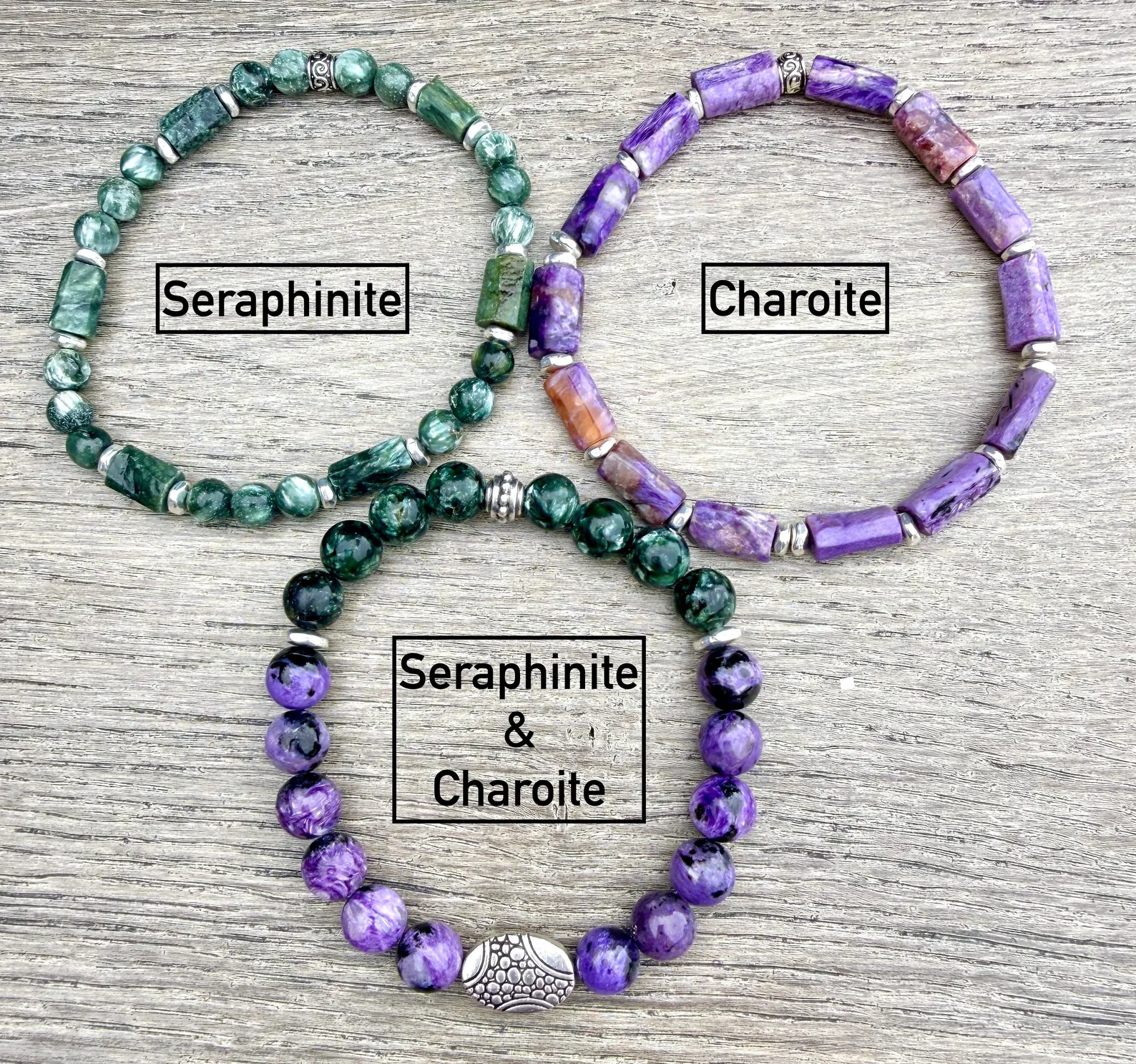 These Charoite & Seraphinite natural stone stretch bracelets bring striking color to your wrists! Both stones are from Russia, and they really compliment each together!
