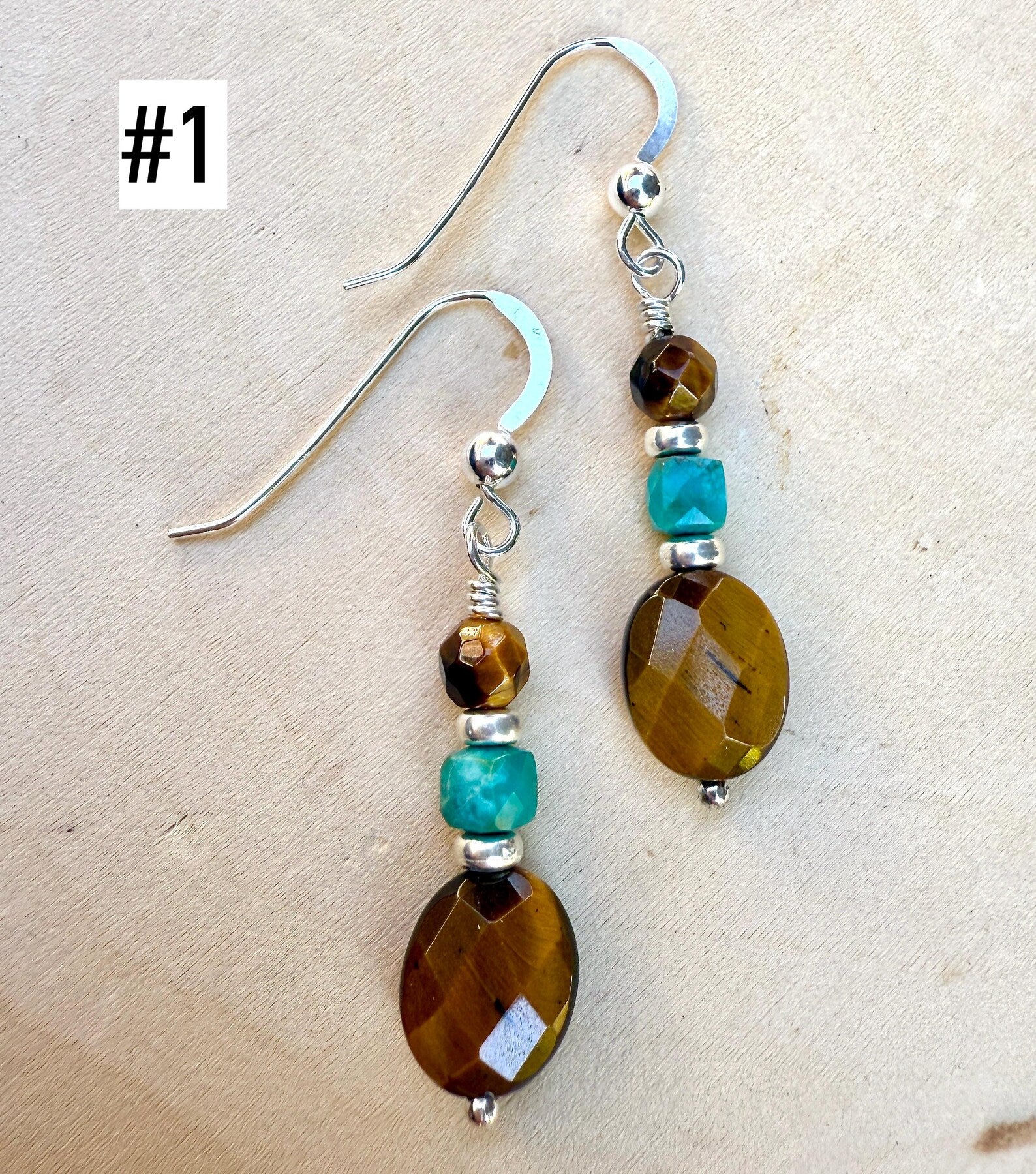 #1 - 8x10mm faceted oval Tiger's Eye bead is stacked with a 4mm faceted cube Turquoise bead and 4mm faceted round bead. They are separated with silver plated heishi beads. All wire wrapped and attached to sterling silver flat ear hooks. The dangle from bottom of the hook is 1".