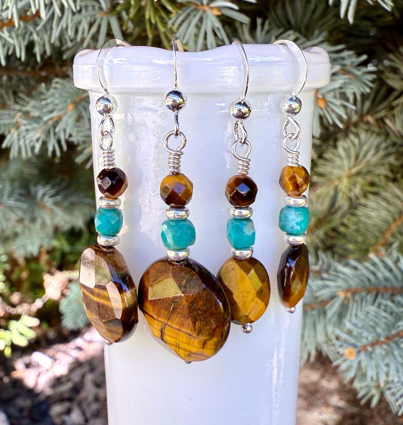 You have a choice of two stunning gemstone dangle earring sets to choose from, both with Tiger's Eye, Turquoise and Sterling Silver.