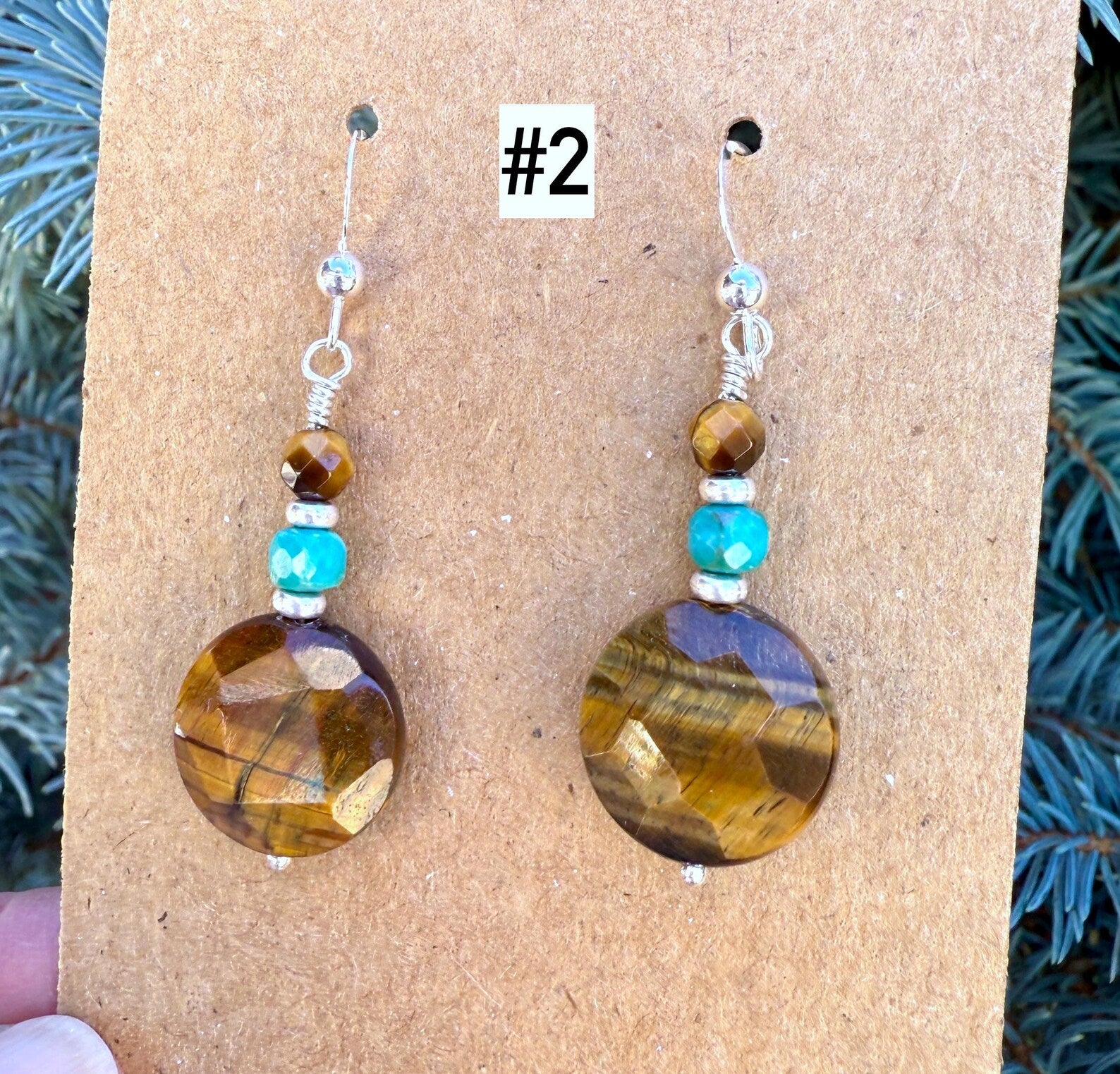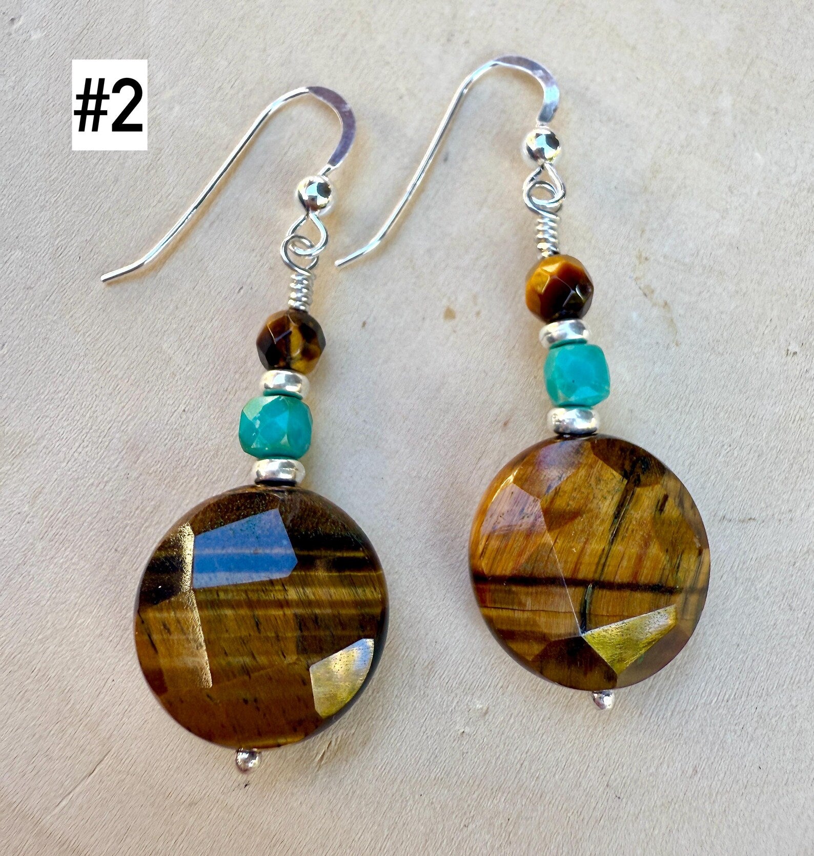 #2 - 15mm faceted coin shaped Tiger's Eye bead is stacked with a 4mm faceted cube Turquoise bead and 4mm faceted round bead. They are separated with silver plated heishi beads. All wire wrapped and attached to sterling silver flat ear hooks. The dangle from bottom of the hook is 1.3".